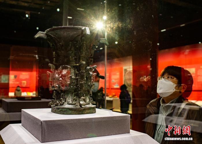 2022年1月26日,“何以中国”展在北京故宫博物院举行。图为观众欣赏西周“何尊”展品。“中”“国”二字作为一个词组最早见于“何尊”铭文中的“宅兹中国”。中新社记者 侯宇 摄