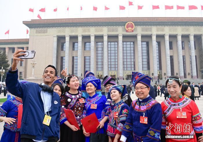 2025年3月11日,十四届全国人大三次会议在北京人民大会堂举行闭幕会。图为闭幕会后,外国记者跟全国人大代表合影。中新社记者 贡嘎来松 摄